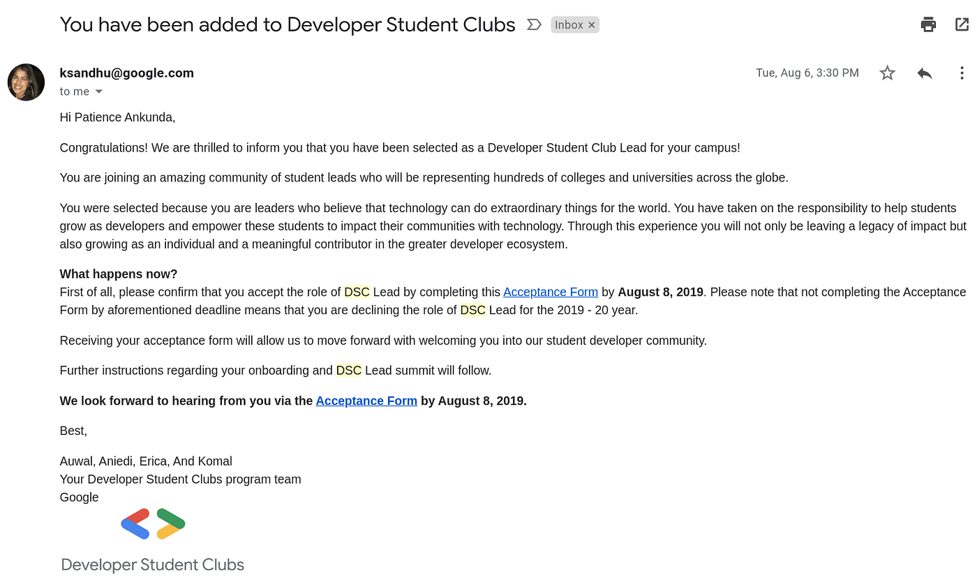 After a month or so, I got an email for the next stage of the application process which was an online interview. Interestingly enough, the gentleman who interviewed me had a similar background as me (architecture to technology) and we just hit it off from there. In August, as I was attending a farewell dinner for my brother, I got an email congratulating me upon my acceptance as a DSC Lead.